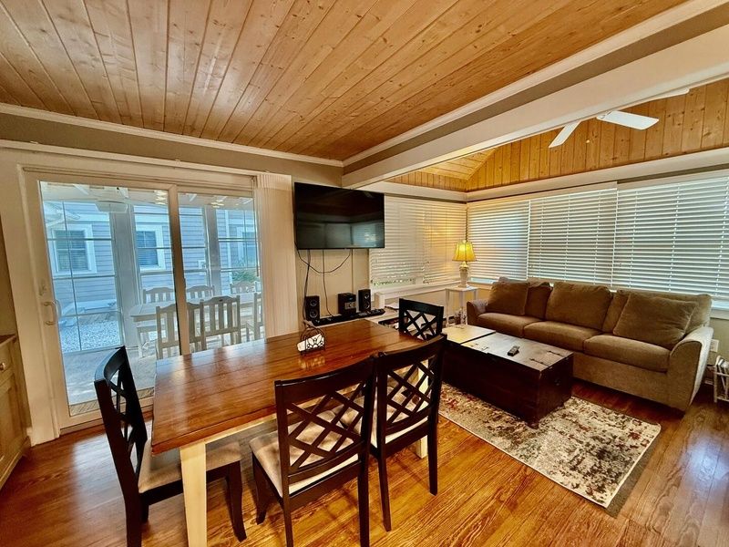 This charming Dog Friendly cottage is located on a quiet street and walking distance to everything in town Rehoboth Beach! Featuring an open kitchen, living & dining area, first-floor enclosed porch with sliding windows/screens, large 2nd floor ensuite with 1King bed and 1daybed with adjoining sun deck, downstairs bedroom (1 Full bed + 1 Twin bed), outdoor patio, gas grill and fully enclosed back yard that offers privacy and freedom for Fido! 1 Full bathroom (tub/shower),1 bathroom with stand up shower and an enclosed outside shower. Also includes SMART TV with cable and Peacock streaming service. Parking for 2 cars in the driveway and 2 Rehoboth Beach permits for use during your stay.
