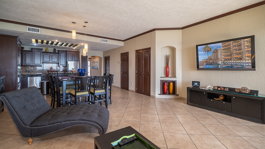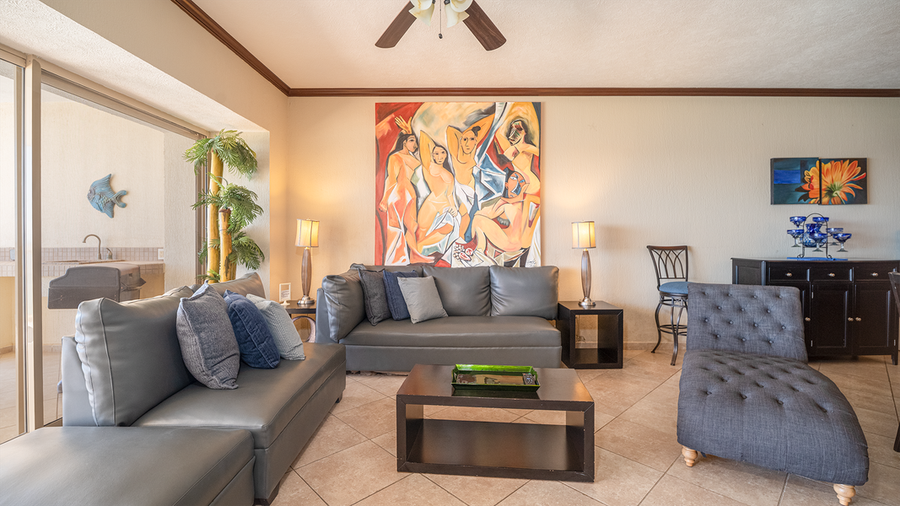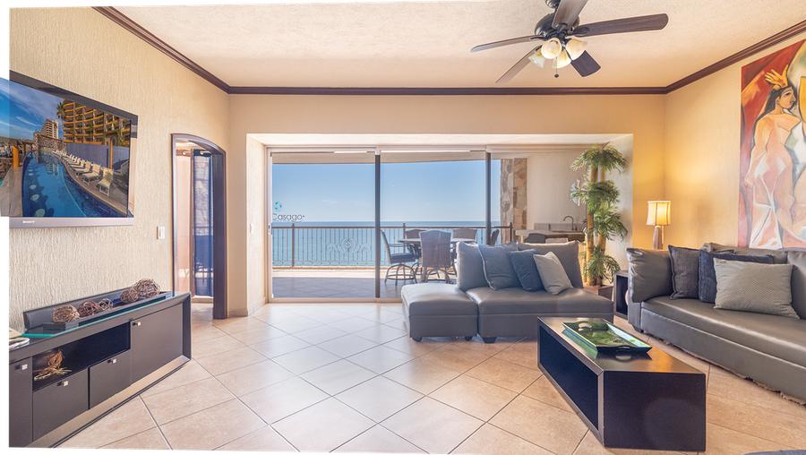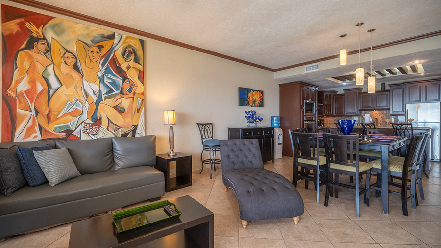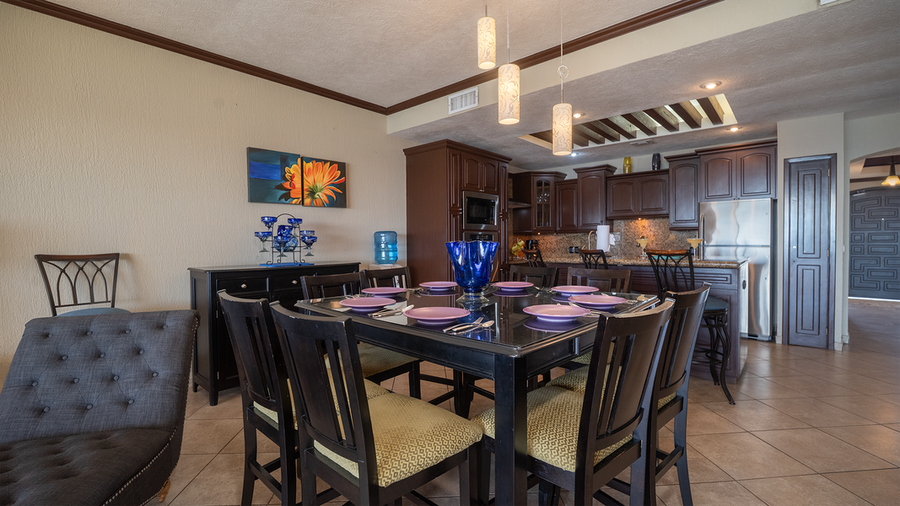 This lovely 3-bedroom is located on the 10th floor of Sonoran Sky Resort and has breathtaking views of the Sea of Cortez and the magnificent sunsets. First of all, there is a secure Internet and a free phone for US calls. The living room has a tan 2 piece sofa and coffee table. The floor is tile; however, there is a beautiful blue rug in the living room area. A flat-screen TV, and a DVD player in the living room. The dining area seats 8 guests. The kitchen is incredible, with stainless steel appliances, granite countertops with breakfast bar and three bar stools. The oven and microwave are built-in and the stove is an electric smoked glass cooktop. There is plenty of storage in the kitchen and the cabinets are beautiful dark wood. Everything you need to be the “chef” is in this kitchen. The master bedroom bed is king size it has his own bathroom with a tub and a flat-screen TV with cable on wall. The second bedroom has a king-size bed with a privet bathroom, there is a flat TV on the wall. 3rd bedroom sleeps 4 with two sets of twin bunk beds and a full bath in hall. Comes with Private secure high-speed internet. The most impressive feature of this suite is, of course, the incredible terrace, beautiful bar height round patio table with 6 chairs and two lounge chairs for sunning. Here you will find the most amazing views of not only the Sea of Cortez but also the beautiful Rocky Point sunsets. As you look down over the terrace you can see the beautiful pools, palapas and of course Sandy Beach. Make this your retreat from the hustle and bustle north of the border. Enjoy a margarita on the beach and relax. See you soon