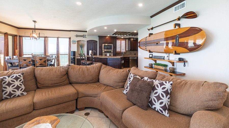 This particular deluxe condo has been professionally decorated with top of the line furnishings. All the bedrooms in this unit have mirrored closets, TV and DVD players. Two of the four bedrooms have access to the wrap-around terrace. There is one bedroom with a bunk bed set that is queen on the bottom and twin on top. The living room of this condo has a huge arched tan suede sofa that has one side as a chaise lounge and the other side folds out to a queen-size bed for two guests. This condo can accommodate 10 people. The kitchen has dark wood cabinets, granite countertops, and a wet bar. The wet bar has a built-in wine chiller. The kitchen has stainless steel appliances. The dining area of the condo has a large high top table set to seat 6 people. The terrace has been furnished with BBQ, a wicker seating area, and a set of lounge chairs.