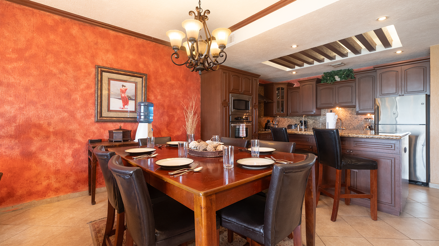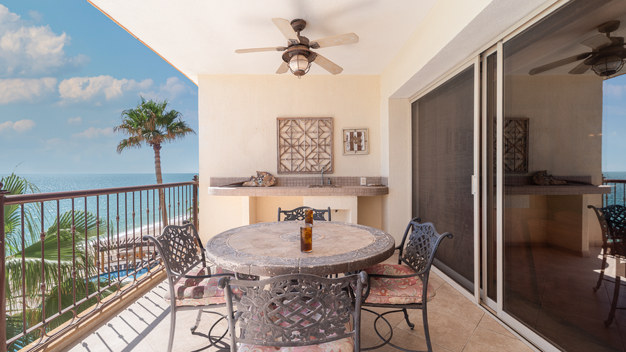 Welcome to paradise. This 2 bedroom, 2bath suite is located on the 4th floor of the beautiful Sonoran Sky Resort. This suite can easily accommodate 4 guests. This suite is fully equipped to make your stay simply wonderful. There are ceiling fans throughout and the color scheme is simply beautiful. The living room area is subtle earth tones. The ceiling is white and the walls are terracotta colors, there is dark ceiling molding around the entire unit. There is a dark brown sofa and love seat that gives contrast to two single couch chairs with complimenting throw pillows in pink, browns, and gray. There is a rug under the sofa that is light gray. Behind the sofa are two picture frames and across from the sofa is an entertainment center that includes a big flat-screen TV, DVD, and Stereo. There is also a sofa sleeper. What more could you ask for! There are 2 beautiful lamps on the end tables next to the couch that will give bright to this area. In addition, there is a large coffee table. The sofa is arranged so that you can relax and gaze out the patio door at the sunset, or simply relax and watch TV. The kitchen has all stainless steel appliances with a built-in oven and microwave. Everything you need to prepare a gourmet meal is in this well-equipped kitchen. The wet bar also serves as a cozy breakfast bar and easily seats 2. The countertops and backsplash are all granite and there is plenty of cupboard space and prep space. The bar stools are wood and have leather seats. The dining area has a matching buffet and square table which seats six. The chairs are high backs with dark leather seats. The walls are adorned with beautiful, bright color paintings and metal art designs. The master bedroom has a beautiful King size bed set with matching headboard, footboard, 2-night tables and a six-drawer dresser. There is also a white single couch chaise that can be used to read a book or relax and hear the ocean. The bedding is a pearl white color with matching shams. Next to the bed is a small gray rug. There is a big flat-screen TV on top of the dresser. You will love the patio door that opens onto the terrace. The master bathroom has a double sink vanity with a large mirror and plenty of lighting. There is a tile, built in shower with glass door enclosure. Across from the shower is a deep Jacuzzi bathtub. There is beautiful tile work throughout the bathroom area. The guest bedroom has a queen size bed with dark brown with a wood headboard. There are a matching 6-drawer dresser and 2 two-drawer night tables. On top of the dresser is a flat-screen TV. There is also a lovely area rug under the bed, which enhances the bedding, which is a white with copper color with matching charms. The guest bath has a single sink vanity and a lovely shower. You can entertain on the terrace or just relax. There is a large wrought iron table with a marble top that seats 4, a chaise lounge chairs and a patio sofa. The views from the 4th floor are amazing. Bring your binoculars because you can see all the way to Bird Island and Las Conchas from this elevation. The most magnificent view, however, is the Rocky Point sunset. As the sun goes down in shades of yellow and orange it slowly changes to the most incredible shades of blue. Relax and enjoy your stay. Charcoal barbeques are available on the third floor near the playground area. Don't miss the opportunity to enjoy this gorgeous property at the Sonoran Sky Resort.