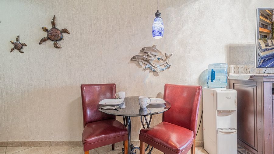 The living room has a lovely dark leather sofa which also folds out into a queen-size sleeper bed. The sofa has an upgraded memory foam mattress then can easily sleep, two children. Behind the sofa is a large wood framed mirror and across is an entertainment center with a 55" Smart flat-screen TV, DVD player, surround sound system, and a private hi speed internet connection. All of this leads to a patio which offers the wonderful sounds and colors of the Sea of Cortez. Depending on the time of year sunset views are included free of charge. Nighttime brings amazing views of the city lights of Rocky Point. The patio contains a cushioned chaise lounge and a table that seats 4, perfect for enjoying your morning coffee or afternoon margaritas.