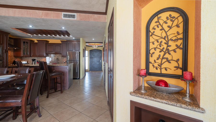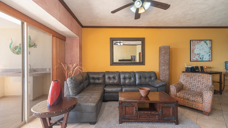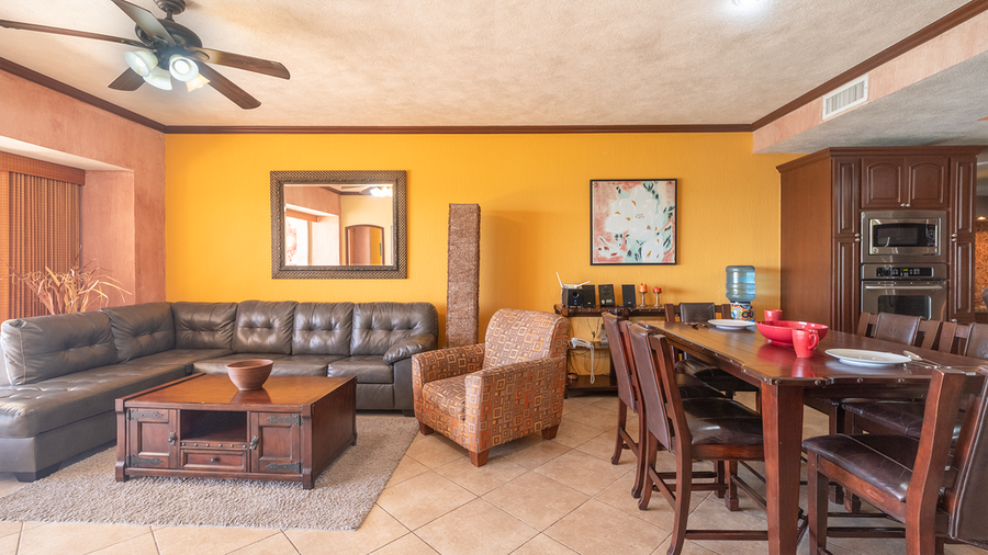 The terrace has been furnished so that you never miss an amazing sunset over the Sea of Cortez. Rocky Point has some of the most beautiful sunsets in the entire world. You will not want to miss them. The terrace has a dining table set to seat four people, a wet bar, and two chaise lounge chairs. The wall of the terrace above the wet bar has been decorated with a metal gecko lizard. The condo comes with a washer, dryer and ceiling fans throughout! Welcome to paradise! We can't wait for you to see what everyone is talking about!