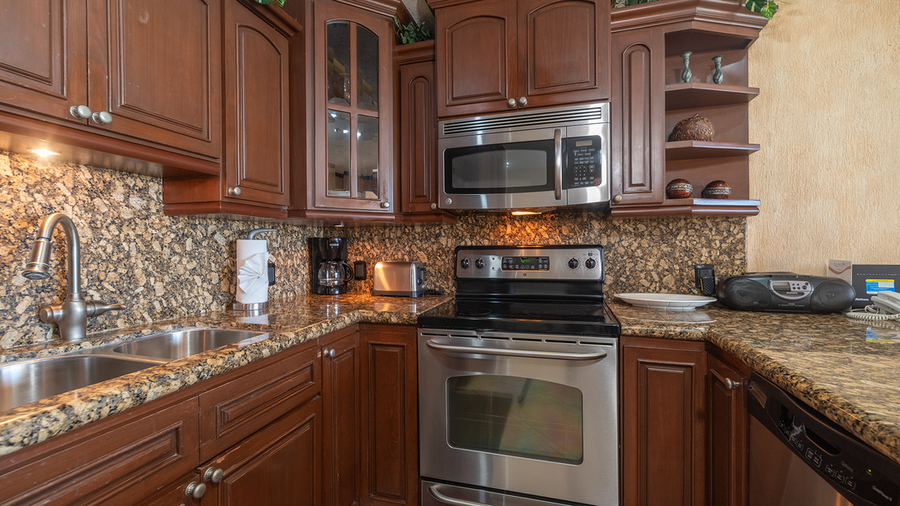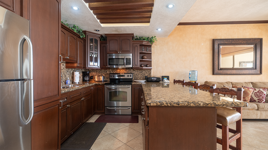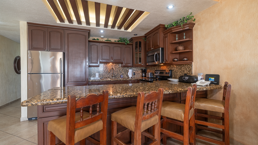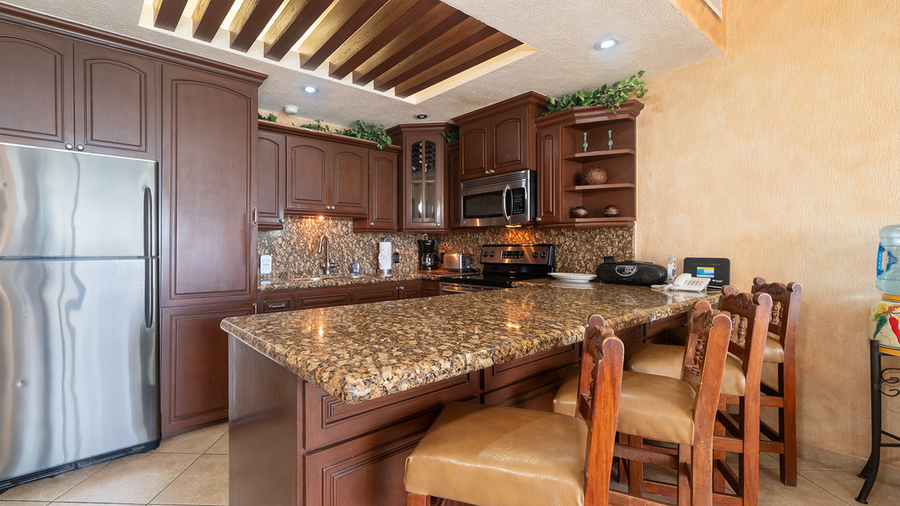 This beautiful condo is located on the 4th floor of the resort. This condo can accommodate up to 4 guests; two in the bedroom and two on the pull out sofa in the living room. The living room of this unit has walls that are finished in soft yellow Venetian plaster. The sofa is shiny tan leather and the pillows are shades of beige, khaki, and tan. Off to the side, there is a seafoam green armchair and in the center, there is a glass top coffee table and a queen size sofa sleeper. Beneath the coffee table, there is a handwoven Oriental rug in a floral pattern. Above the sofa, there is a large mirror that makes the room feel very open and spacious. A sliding glass arcadia door will take you out to your private terrace where you can enjoy the sunrise or sunset over the Sea of Cortez. The living room has a flat-screen plasma TV, DVD, VCR, and a stereo system. The condo has no formal dining room but there is seating on the bar stools butted up to the wet bar off the kitchen. The kitchen has dark wood cabinets, stainless steel appliances, and granite countertops. This kitchen has all the items you could possibly need to prepare a five-star meal. The master bedroom has a dark wood furniture suite which includes a king-size bed, bedside tables, dresser, and an attached mirror. In the corner of the room, there is a wall-mounted TV with a DVD player. The room has a window with a view of the ocean. The master bathroom has a single sink vanity and a walk-in shower made of marble. One wall of the bathroom is painted bright orange and the others are a Swiss coffee white.