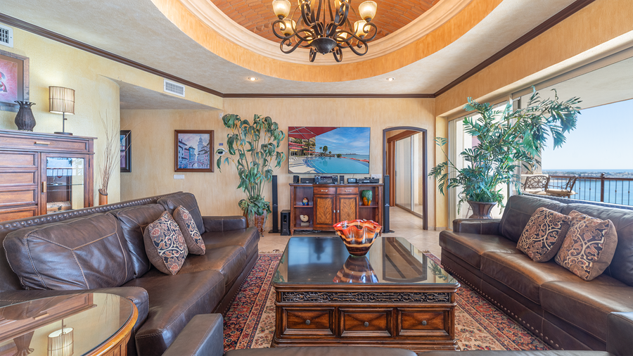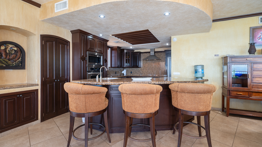 Located on the 15th-floor Penthouse Level of the Sonoran Sky Resort is this magnificent 4-bedroom, 4-bath. The suite comes with high-quality private internet as well as both resort cable television and Direct TV. The walls are tonnes of gold with burnt orange contrast and the ceiling is cream and there is dark crown molding throughout this suite. The entrance and living room has a beautiful domed ceiling with chandeliers. There are also ceiling fans throughout this suite. The living room, with wrap around patio doors, invites the Sea of Cortez to engulf this suite with the warm salty air, and gentle breeze only found in Rocky Point. In the early morning, you can enjoy the sunrise over the Point. During the day you can open the doors and enjoy the breeze, in the late afternoon and the magnificent colors of the sunset and at night as the sun has lowered you can enjoy multiple shades of blue as the sky and sea meet and reflect off each other. The views and hues are beautiful. You can enjoy this from both master suites, the living room, and the dining area. The living room has a beautiful domed ceiling with an elegant chandelier above the sofa area. There are two fabric covered sofa's and a stone and metal coffee table on an area rug in subtle shades of yellow, rust, and brown. The sofa area is surrounded with beautiful decorative lighting and pots with silk arrangements. The dining area has a dark wood table which seats 8 guests. The chairs are high back with leather seats. The kitchen is a dream come true for those who like to cook. The appliances are stainless steel and the countertops and backsplash are granite. The microwave and oven are built in and the stove top is a flat glass corning surface. There are a large pantry and ample prep space and storage space. The island bar serves as both an entertainment area with a wine refrigerator, wet bar and easily seats 3 for a quick morning breakfast bar. One of the master bedroom suites has a king size bed set with wicker insets. The wall behind the bed is a large palm leaf and parakeet design as the headboard. There are two matching night tables, dresser, and bench at the foot of the bed. The closet has double sliding mirror doors, and there is a ceiling fan with lights above the bed. Across from the bed is a large matching dresser and above it, a wall hung flat screen TV. The bedding is a palm tree design that matches the headboard with complimenting throw pillows. This master bath includes a double sink vanity, a large marble and glass double rain shower and a well-lit dressing table with leather bench. The second master bedroom suite has sliding patio doors that open onto a private terrace area. There is a king size bed set in light-wood with matching dresser and night tables. Above the bed is a ceiling fan with lights. Above the 10 drawer dresser is a wall mounted flat screen TV. The closet has double sliding mirror doors. It has a rain shower and jacuzzi. The bedding is a seafoam green, with complimenting throw pillows. The third bedroom is also an ensuite and has a queen size bed with a beautiful headboard with animal decor and a palm tree spread. There is a wicker chair with matching cushions. This bedroom also has a private bath with single sink vanity and rain shower. It has a light wood bedroom set with matching night tables and dresser. In the fourth bedroom, there is a queen size bed with a headboard and a unique metal piece of hanging art. There is a ceiling fan above the bed and a wall-mounted TV above the dresser. This bedroom also a closet with double sliding mirror doors and a window which offers great night time views of the sunset. There is a guest bath is in the hallway next to the fourth bedroom with a sink vanity, rain shower and a large floral design on the wall. The laundry room is down the hall and also has a full-size washer and dryer and ample storage space. There is very tasteful artwork, and unique metal hanging art designs as well as plenty of silk floral arrangements throughout. The terrace is magnificent. There is a round table, which seats 8 and heavy wicker chairs and sofa set and a marble-topped coffee table. Enjoy a quiet dinner or just relax and enjoy the sights and sounds of Rocky Point. Whatever you choose, relax and enjoy it. NOTE: The balcony BBQ do not work, there is a designated area on the 3rd floor for the use of charcoal grills and playground for small children. (Charcoal is not included, for sale at convenience store). Security Deposit Policy: There is a damage security deposit of 300 USD during Semana Santa/Easter Weekend and Spring Break (from March through April 10th), and 200 USD for the rest of the year. The deposit can be left in cash or by credit card at the time of arrival. Please note that credit card deposits incur a 3% processing fee. Casago - Rocky Point has engaged VacayHome to ensure this listing contains all the information you need and that it is easy for you to book via search engines & online channels. VacayHome is connected directly to the property management system used by Casago - Rocky Point which ensures that availability & rates are up-to-date & accurate. When you book, VacayHome processes payment on behalf of Casago - Rocky Point and a charge will appear on your statement as "VacayHome". VacayHome will send you a confirmation e-mail that contains all the information you need to prepare for your vacation including arrival instructions. VacayHome has a 24 x 7 team to assist you with any questions or concerns you may have prior to arrival. To access VacayHome, obtain the customer support telephone number or read FAQs, please click on the links at the bottom of this page.