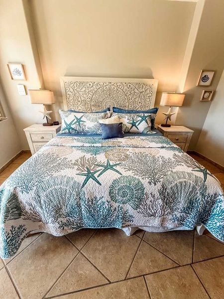 The outside patio is in a perfect setting with lush landscaping all around for privacy. It boasts amazing sunsets from the patio and the water can still be seen even from the first floor. This is one of the largest outdoor patios for a 2 bedroom condo at Bella Sirena. There is a covered patio area with an outdoor ceiling fan, a large patio sofa, a coffee table, 2 comfy chaise lounge chairs to enjoy a morning coffee and a patio table that seats 4 under the shade of an umbrella. This patio is fully enclosed, very private, and has a quiet setting, perfect for entertaining or relaxation with a Cuisinart cooking table outside. This condo is in building “A” and is a short walk down a lovely, lush walkway to the Sea of Cortez beach, or the 4 pools and 2 Jacuzzi's nearby, as well as a putting green and tennis courts. There is a large charcoal built-in BBQ nearby for family fun and entertaining. There is ample parking for all guests just outside.