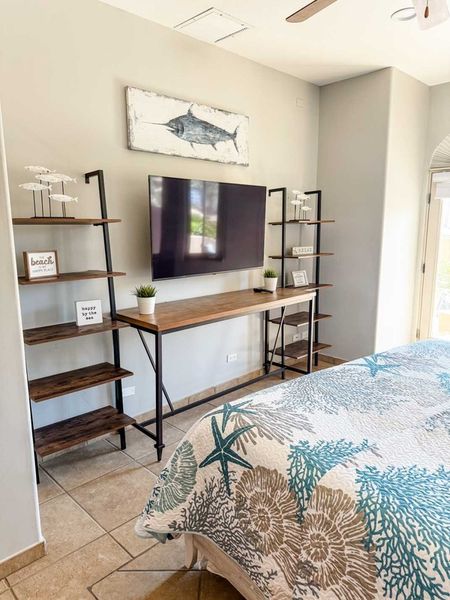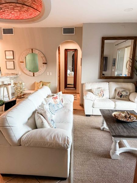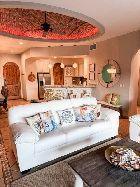 The living room has a beautiful blend of new furniture from the USA as well as custom furniture from Mexico to provide comfort, relaxation, and ample seating, such as 2 leather sofas. There is a ceiling fan and LED rope lights around the ceiling dome for the perfect glow in the evenings. The colorful dining room has seating for 6, a buffet table, and a chandelier with a dimmer. A large birdcage with 2 ceramic parrots (meet Pirata and Lucas) and colorful wall plates from around the world complete the room. It makes for a very colorful and cozy atmosphere.