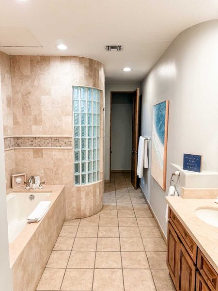 The Master bedroom is a soft gray paint color; it has a very comfy king-size mattress under a white canopy and elegant furniture/ décor. It offers a romantic atmosphere, perfect for a honeymoon. Soft bedding and linens, with pillows of all sizes, complete the perfect night's sleep. There is a large walk-in closet with extra pillows and blankets and an attached, spacious, and lavish 5 piece bathroom: with an awesome shower, double vanity, and private toilet.