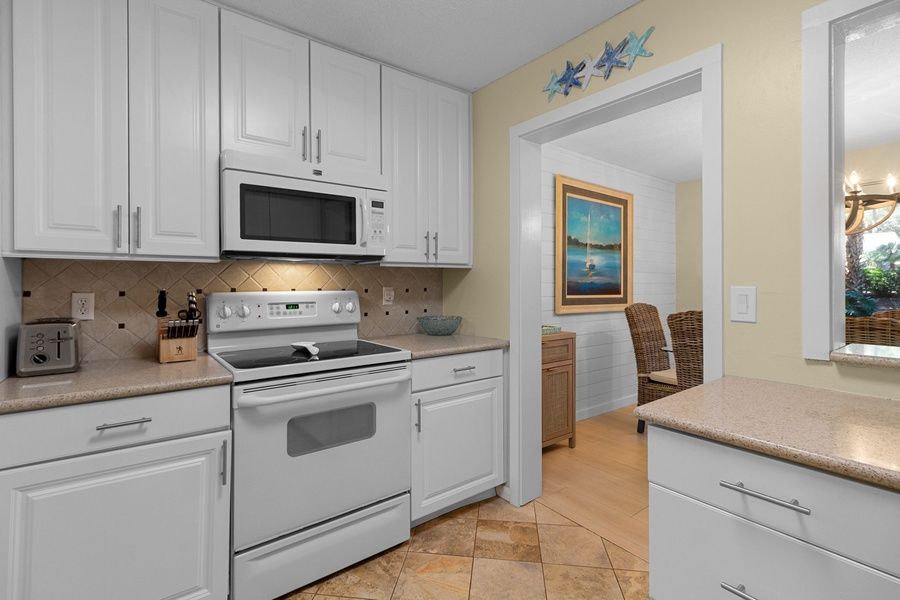 The open floor plan ushers you in, drawing you forward with exquisite, wooded views through a wall of sliding glass. To one end of the main room, a living room sets a sleeper sofa, loveseat and armchair around a sun-lit conversation area with flat-screen TV. To the other, formal dining for six enjoys landscaped views and easy access to the kitchen. Sliding glass doors in either space give way to a tranquil pebblestone patio offering sun-dappled relaxation with al fresco dining for four, separate conversation area for morning coffee or evening drinks and gas grill.
