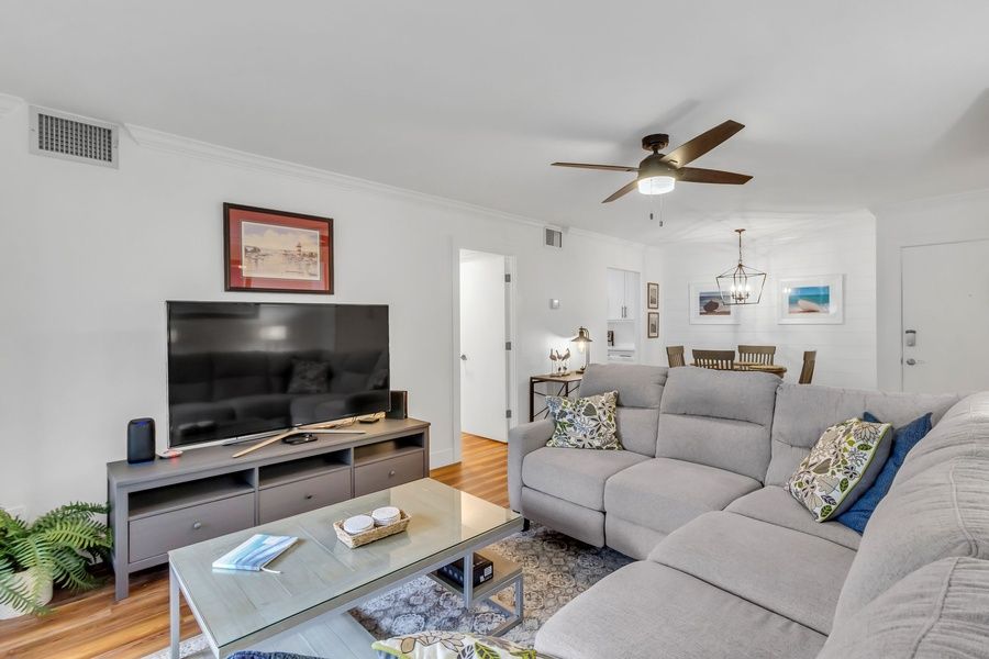 The primary bedroom basks in spaciousness, with a king-size bed at the center as well as a ceiling fan, flat-screen TV and floor-to-ceiling windows. This room enjoys access to a wonderfully updated bathroom with walk-in shower.