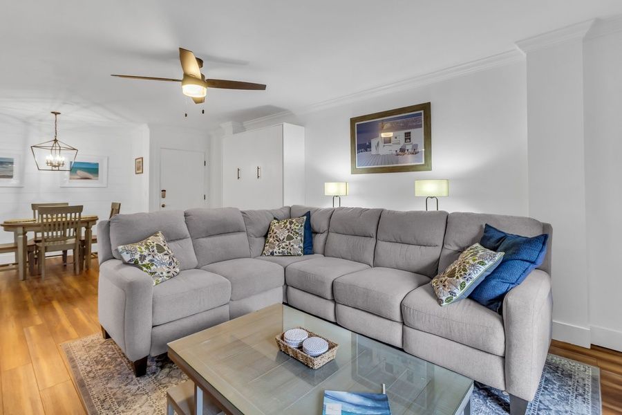 Luxury vinyl plank flooring runs throughout the villa, stretching from the great room into the expansive primary bedroom. In the great room, it informs the elegant atmosphere of a space that boasts a wide sectional sofa facing a flat-screen TV as well as a concealed murphy bed. Sliders beyond open to an intimate patio for two gazing out over lush greenery.