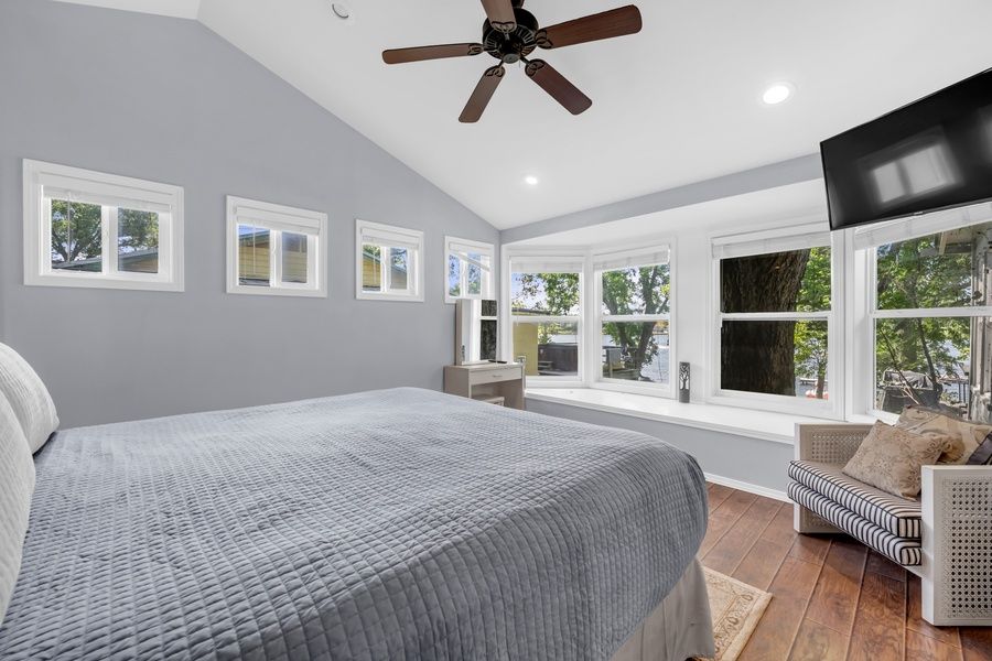 The primary bedroom is a cozy retreat in itself, enclosed by wood-framed, glass-paneled doors. It features a plush queen-sized bed, a large smart TV, and tranquil views that make waking up here a delight. The ensuite bathroom includes a tiled shower and custom vanity.