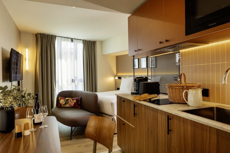 Its 25m² of optimized space includes a fully equipped kitchen, premium bedding, and a bathroom with a shower. Enjoy 4-star hotel services available 24/7, including access to the lobby, luggage storage, and à la carte services.
