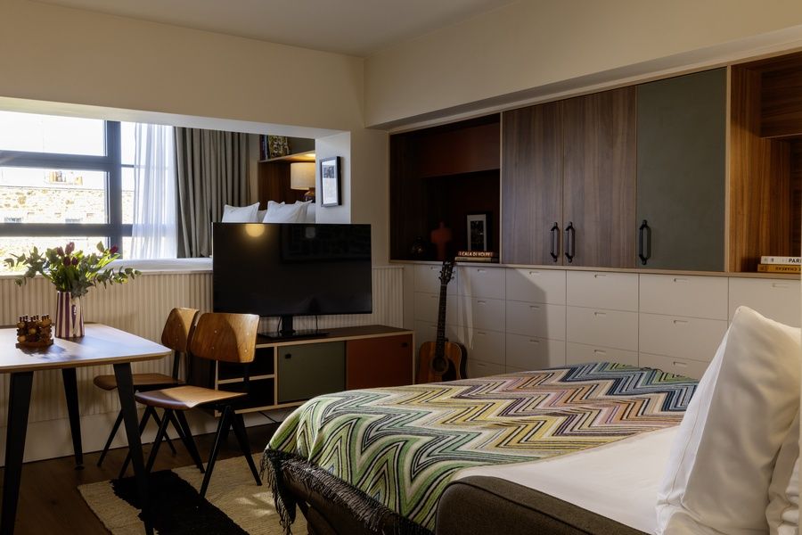 Our Top Floor studio, located on the hotel’s top level, offers 40m² of comfort with stunning views over the Parisian rooftops. Enjoy a fully equipped kitchen, mezzanine sleeping area, convertible sofa, and a modern bathroom with shower.