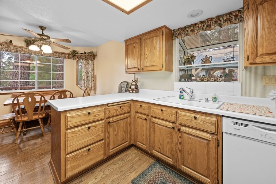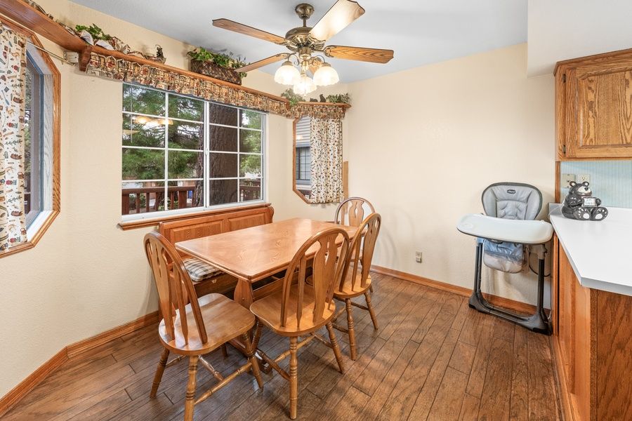 This charming lower Moonridge home boasts an ideal location—just a short walk to the ski shuttle, zoo, shops, and restaurants along Moonridge Road! Enjoy the serene mountain setting from the large front decks or relax on the private back deck while listening to birdsong and soaking in the fresh alpine air. Inside, the spacious living room welcomes you with a cozy fireplace and comfortable furnishings. The open kitchen offers a generous dining area, highlighted by a beautiful bay window and warm wood flooring.