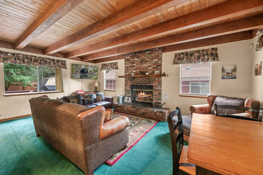 LIVING SPACE - Spacious 1300+ sq ft home with living room, dining table, bar seating, smart TV, wood burning fireplace, and plenty of comfortable living room seating.