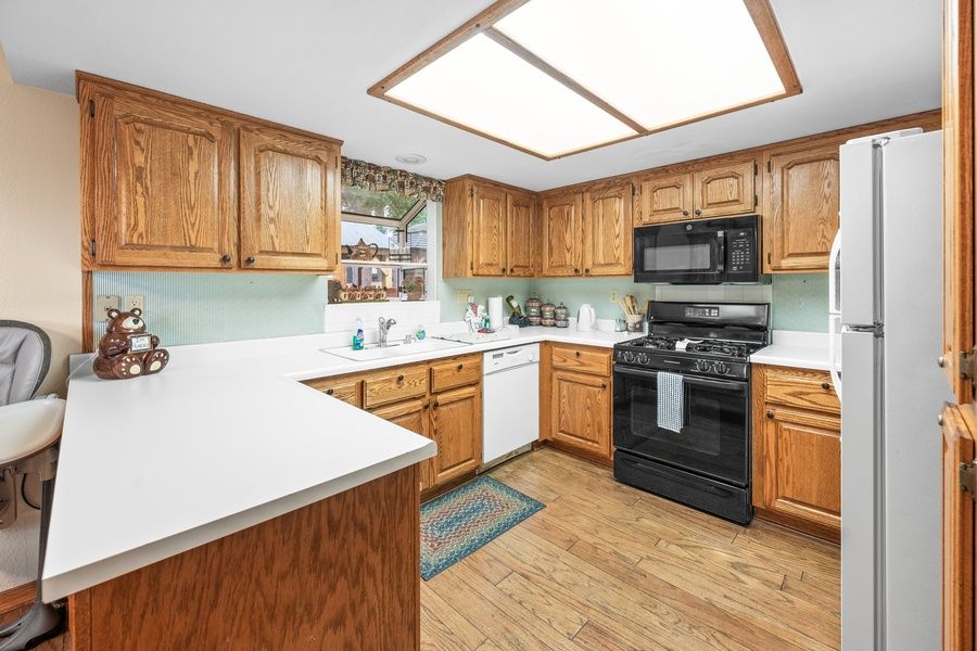 KITCHEN - Stove with oven, refrigerator, microwave, dishwasher, blender, toaster, coffee maker, dishes, pots/pans, and more.