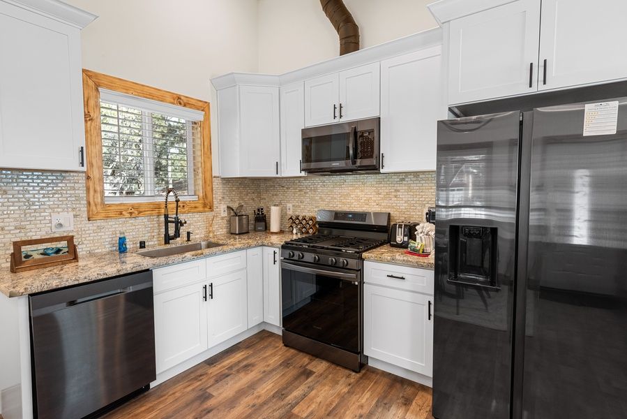 KITCHEN - Granite countertops, stainless steel appliances, five burner stove with griddle and oven, double door refrigerator with water and ice dispenser, dishwasher, microwave, blender, toaster, coffee maker, dishes, pots/pans, and more.