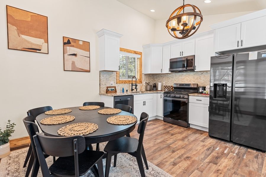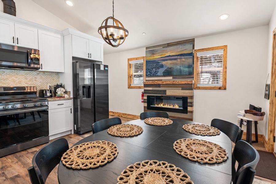 LIVING SPACE - Cozy 600+ sq ft home with (no sofas), smart TV, dining table, and electric fireplace.