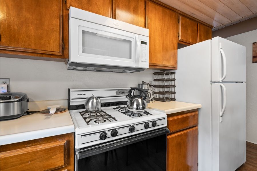 KITCHEN - Stove with oven, refrigerator, dishwasher, microwave, blender, toaster, coffee maker, dishes, pots/pans, and more.