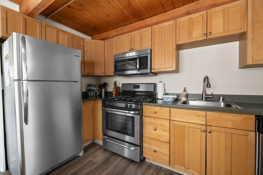 KITCHEN - Stainless steel appliances, stove, oven, refrigerator, microwave, blender, toaster, coffee maker, dishes, pots/pans, and more.
