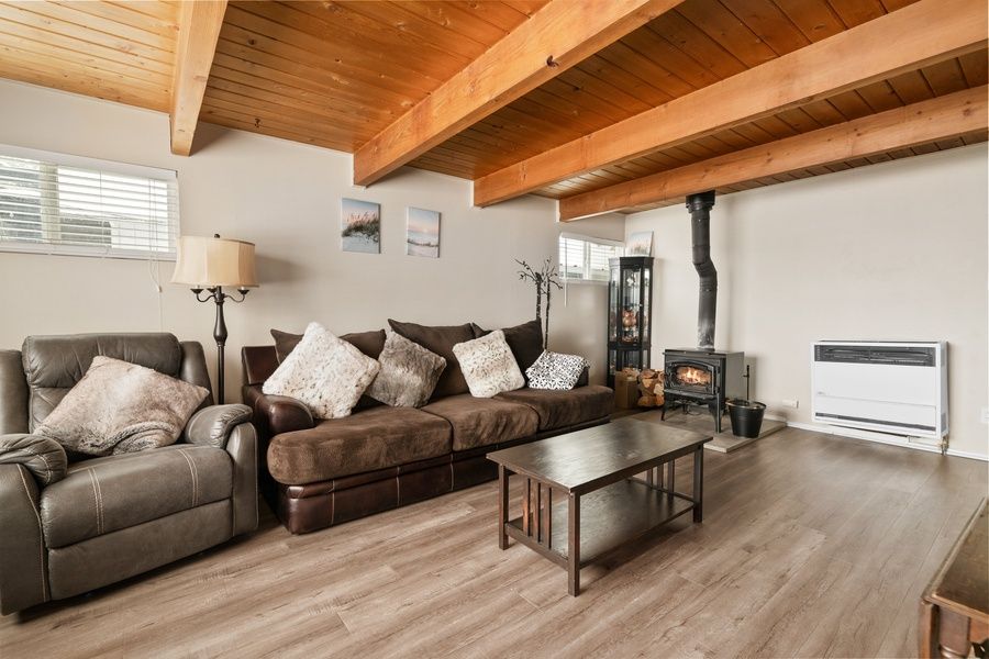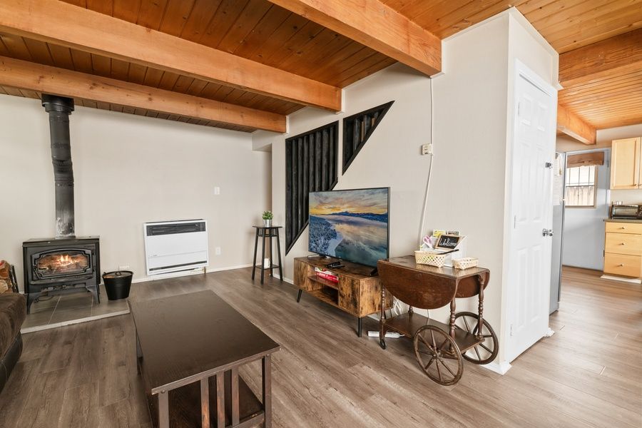 LIVING SPACE - Cozy 900+ sq ft home with living room, TV, dining table, wood burning stove fireplace, and plenty of comfortable living room seating.