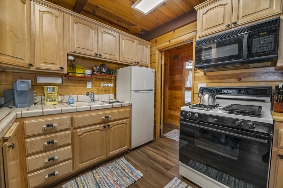 KITCHEN - Stove with oven, refrigerator, microwave, blender, toaster, coffee maker, dishes, pots/pans, and more.