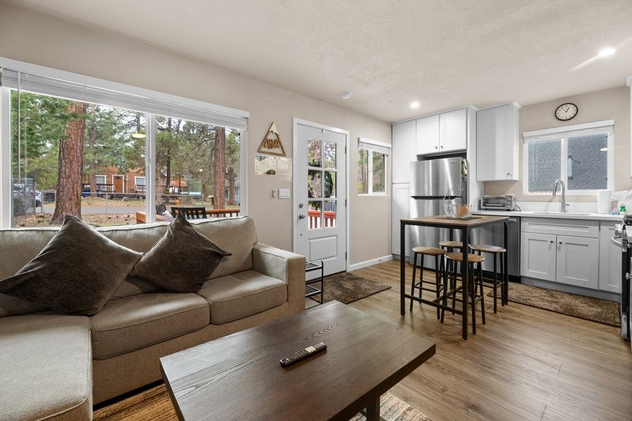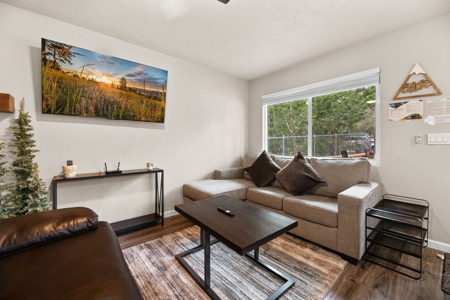 LIVING SPACE - Comfortable 600+ sq ft home with living room, smart TV, ceiling fan, table with stools, wood burning fireplace, and plenty of comfortable living room seating.