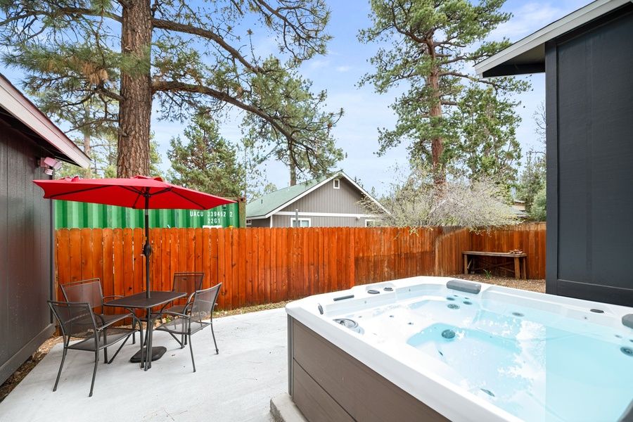 OUTDOORS - Front deck with patio table and chairs. Fenced backyard with hot tub, outdoor furniture, and gas barbecue.
