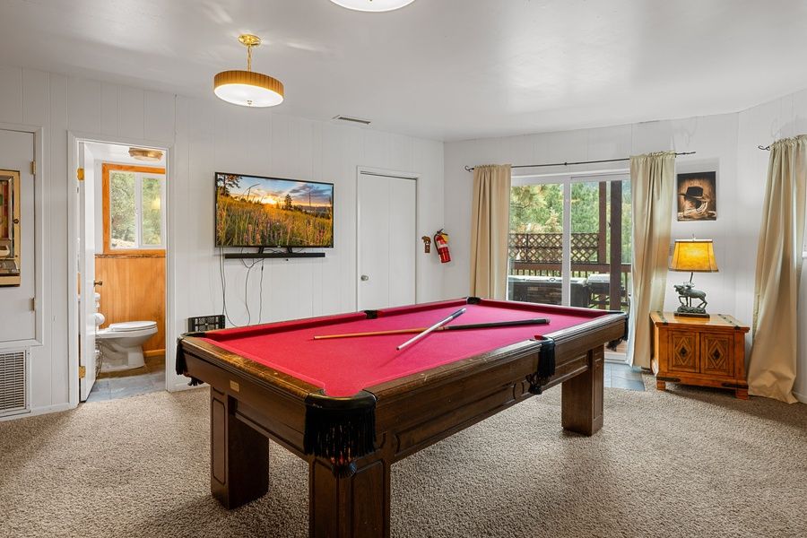 AMENITIES - Downstairs bedroom/game room with a pool table, ping pong, darts, smart TV, board games, and card games. Laundry area with stackable washer/dryer.