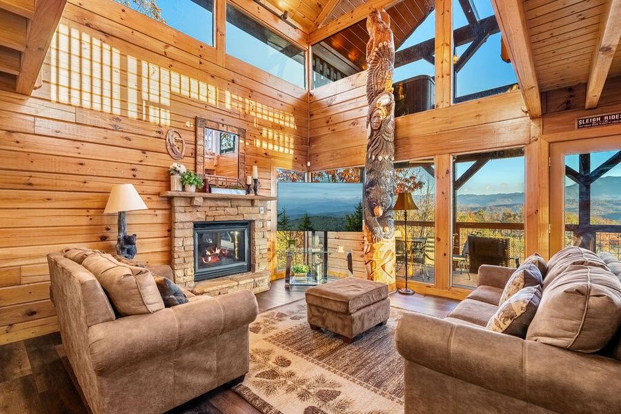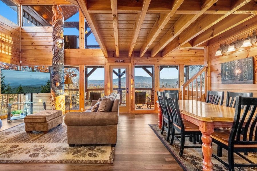 Eagle's View Lodge is a luxurious four-bedroom cabin located in Starr Crest Resort. This spacious cabin is ideal for large families. Eagle's View Lodge sleeps 12 guests with four king beds, two queen sleeper sofas and three bathrooms. Eagle's View Lodge offers a picturesque getaway with awesome mountain views from three decks. The full kitchen and dining area are the perfect spaces to create and enjoy family meals. The living room offers guests a relaxing space with a beautiful fireplace and large flat screen TV. Adults and kids alike will enjoy friendly competition in the game room while playing foosball, pinball, pool and video games. There is plenty of room for everyone to relax in the two private hot tubs. Eagle's View Lodge is 5.5 miles from Dollywood theme park and Dollywood's Splash Country water park. Also, the cabin is just minutes away from other area attractions in Pigeon Forge and Gatlinburg.