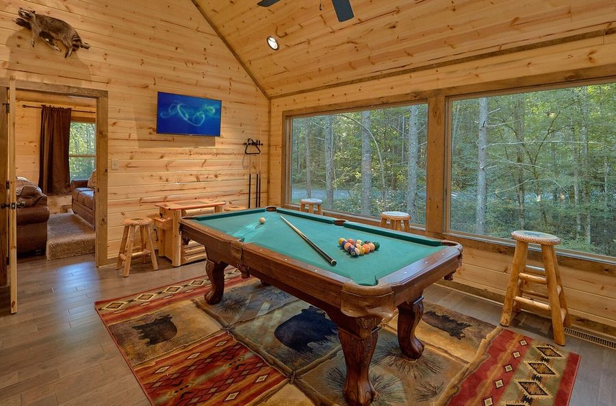 Livin It Up, a stunning cabin, comfortably sleeps 12 people, featuring four luxurious king-sized beds, two queen sleeper sofas, four and a half baths, and a range of captivating amenities. Nestled within just 5 miles from Pigeon Forge and Gatlinburg, it offers an ideal blend of accessibility and seclusion, featuring an indoor pool, movie theater, hot tub, pool table, and fire pit. Its setting provides a serene atmosphere with wooded views visible through several oversized picture windows that artfully capture the natural beauty of the surroundings. Livin It Up caters to outdoor enthusiasts with various activities, including a yard, outdoor dart game, horseshoes, and fire pits, all complemented by expansive covered decks and stacked stone wood-burning fireplaces. This charming retreat is conveniently situated in a flat area, eliminating the challenge of navigating mountain roads. Vibrant with energy, the space is perfect for kids, offering opportunities for bike rides and leisurely strolls after dinner. For larger groups, an identical sister property, "Adventure Lodge," is situated across the street, allowing accommodations to be expanded for a total of 24 guests when both properties are rented simultaneously.
