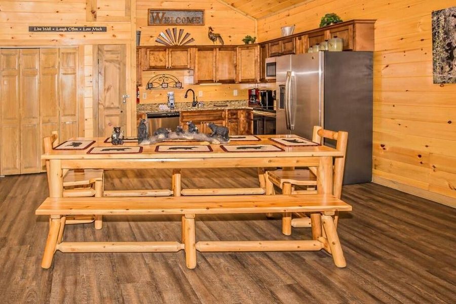 Situated at Bear Cove Falls in the midst of breathtaking mountain scenery, All Bear Paws is a three-bedroom, two-bath cabin home with gorgeous wood accents throughout. This home will accommodate up to eight guests with two king-sized beds and a set of queen-sized bunk beds, making it a perfect mountain retreat for family and friends. The spacious living area is welcoming to all, as the open floor plan makes room for entertainment and relaxation and is outfitted with comfortable seating options, a stone fireplace and large flat screen TV. Stepping over into the kitchen, guests will find a fully-equipped kitchen to help them prepare delicious meals during their stay. Once dinner is ready, guests can sit at the large wooden table, then enjoy the outdoor pool and hot tub for recreation. Other entertainment options for guests are located just three miles from the cabin & Dollywood theme park and Dollywood Splash Country! This cabin also is located minutes away from endless dining options and attractions in Gatlinburg and Pigeon Forge.
