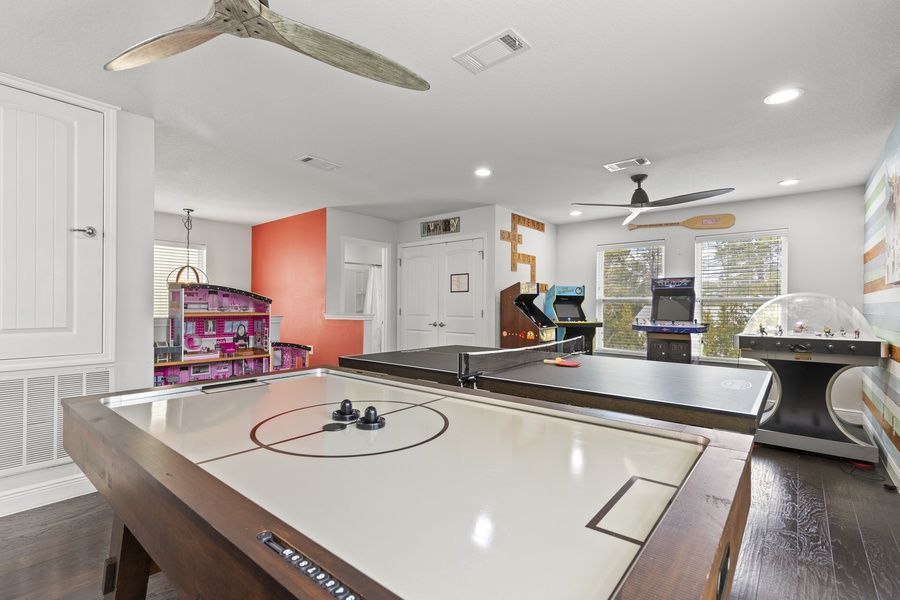 Upstairs, the dedicated game room is a highlight — featuring arcade favorites like Pac-Man and The Simpsons, a ping pong table, mini-bar with wine fridge, and a fun kid’s play area. Space for everyone is easy with comfortable sleeping arrangements throughout the home.