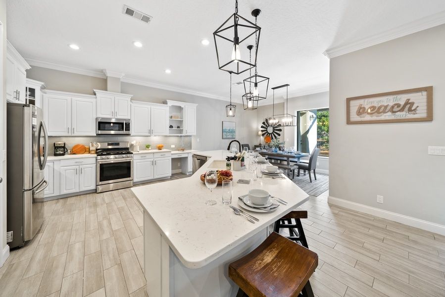 Inside, the open floor plan seamlessly connects a spacious kitchen with bar seating, a comfortable living room, and a dining area. The home boasts three bedrooms with king beds, three full baths, including two en-suite bathrooms, and a fourth bedroom with a cozy queen bed.