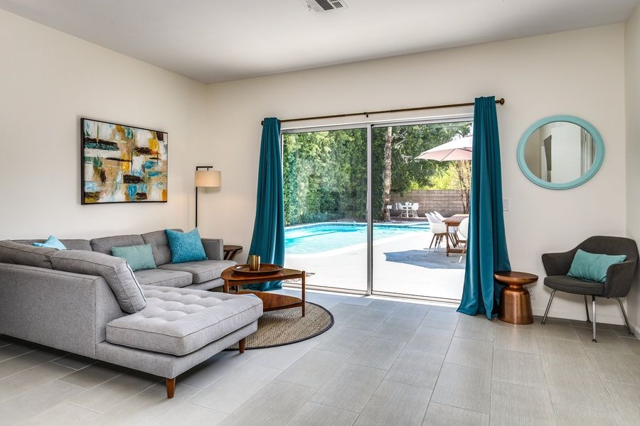 Furnished in a relaxed, colorful Mid-Century Modern style, your home-away-from-home offers plenty of natural lighting, a relaxing mountain view and lots of room for living, working and playing -- including two desks for at-home work and super-fast wi-fi throughout the house.