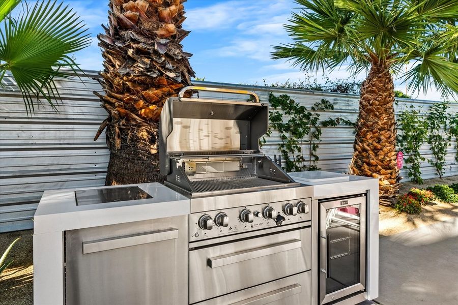 There is plenty of room for your group with the 1626 square feet of home. Each bedroom offers a unique theme and color palette. Monogrammed robes are avaialble for you to add the sprinkles to the sundae that is this fabulous home. The cherry on top you'll find in the backyard with a mural wall to reflect the iconic Birdcage bus stop, complete with newspaper stand. That's what sets this home apart from any other, those details to add luxury and ambiance to your stay here in the Desert!