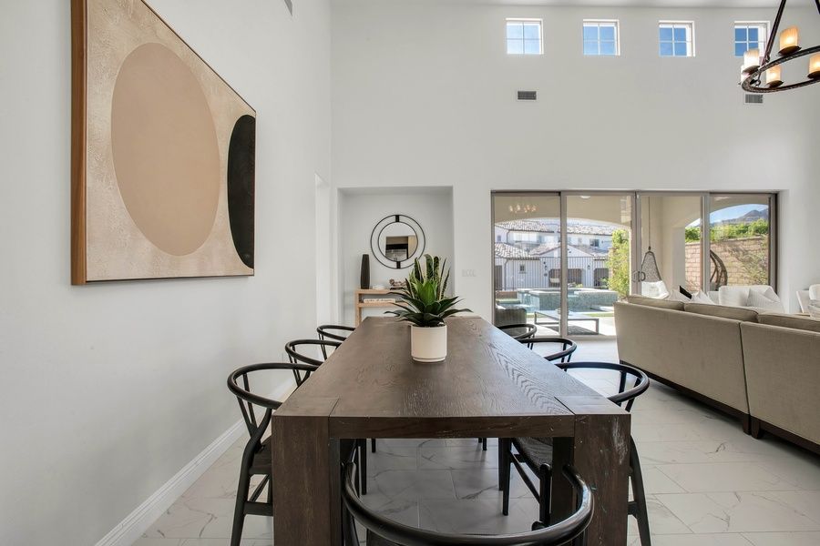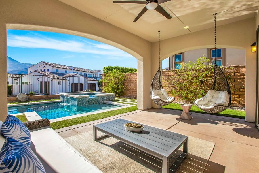 Step outside to your private backyard oasis: a fully enclosed area complete with a heated pool, hot tub, and a luxurious baja shelf for those perfect desert days. Relax on the sun loungers or gather around the outdoor BBQ and bar seating area, situated beside a gas fire pit for evening ambiance. With an outdoor TV, comfy seating, and hanging egg chairs, the backyard space is designed for pure relaxation and entertainment.