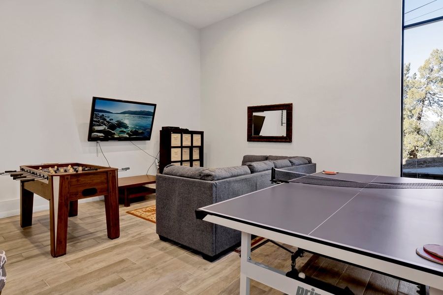 The living area features a bed, futon, smart TV, and a gas fireplace. Sip a crisp drink at the built-in bar for four. The game room is equipped with a sectional, smart TV with Xbox, and ping-pong, foosball, and game tables. The California room features floor-to-ceiling windows that look out to the trees. Sliding glass panels open to the deck.