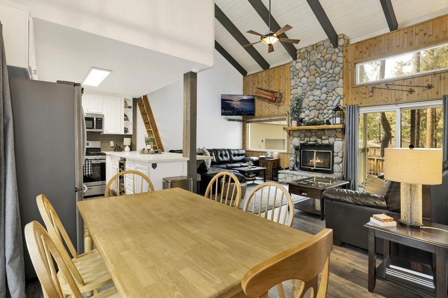 The inviting living area is the social heart of the home, fitted with a sectional, full-size sleeper sofa, and 55in TV with cable and a soundbar. Cozy up next to the warmth of the wood-burning fireplace after a friendly game of foosball. Whip up delectable meals in the well-appointed kitchen, outfitted with a full suite of new stainless-steel appliances -- including a wine cooler. Keep the chef company at the kitchen bar with seating for five. When it's time to eat, gather at the six-person dining table.