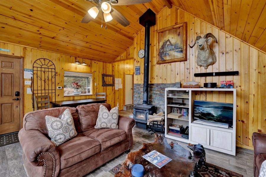 This updated Big Bear cabin is perfect for small families and close groups of friends. You'll have a spacious deck with forest views and fresh air, while free WiFi, cable on the flatscreen TV, a wood-burning stove, and a full modern kitchen are back inside.