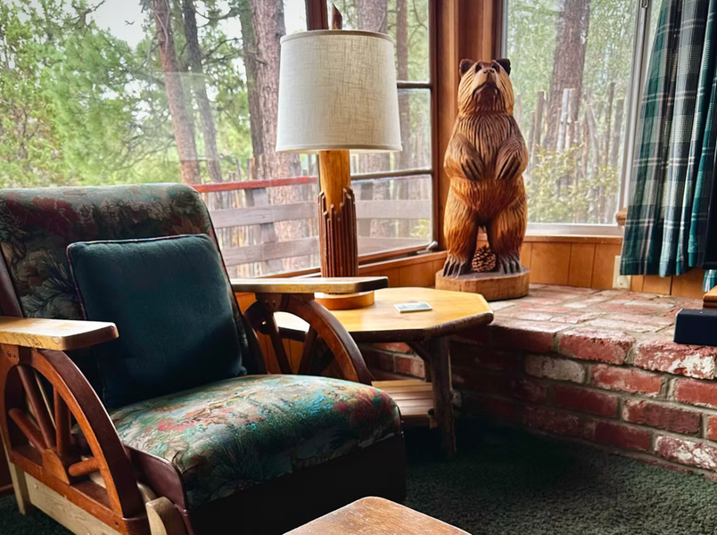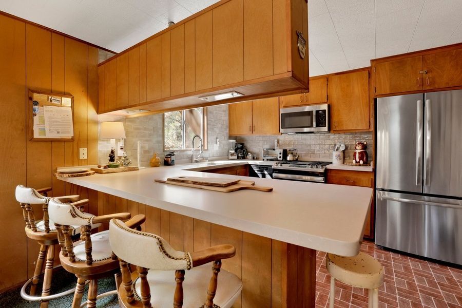 There will be no delay in feeling right at home on this vacation with the nostalgic wood-burning fireplace, vintage furniture, and art featuring tranquil forest scenes, bears, and other cherished wildlife. Head up to the loft area, and you will immediately fall in love with the Modernist A-frame design featuring a fun 'British pub' plaid carpet, rocking chairs, bunk beds for the kids, and tall windows that face century-old pines. A full, recently remodeled kitchen is ready for whipping up tasty meals with ease and the free Wi-Fi and flatscreen TVs will provide more than enough entertainment as the stars come out.