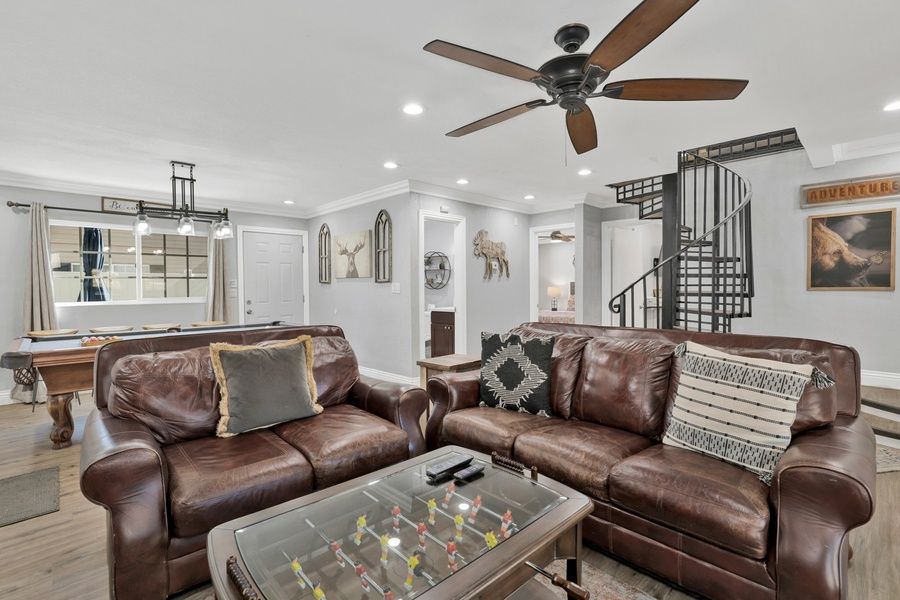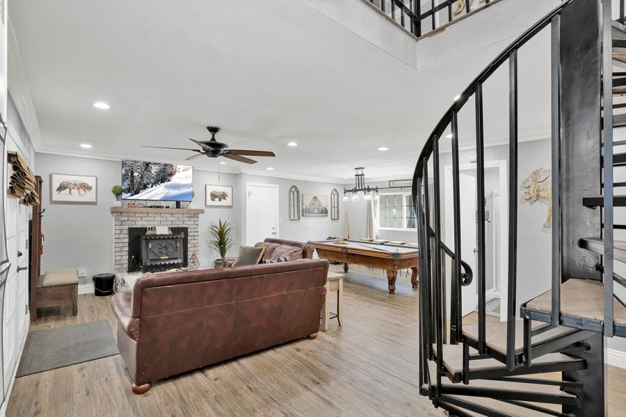 Two welcoming living areas each have ample seating, a wood-burning stove, and a smart TV. One of the rooms has a pool table and the other has a sleeper sofa.