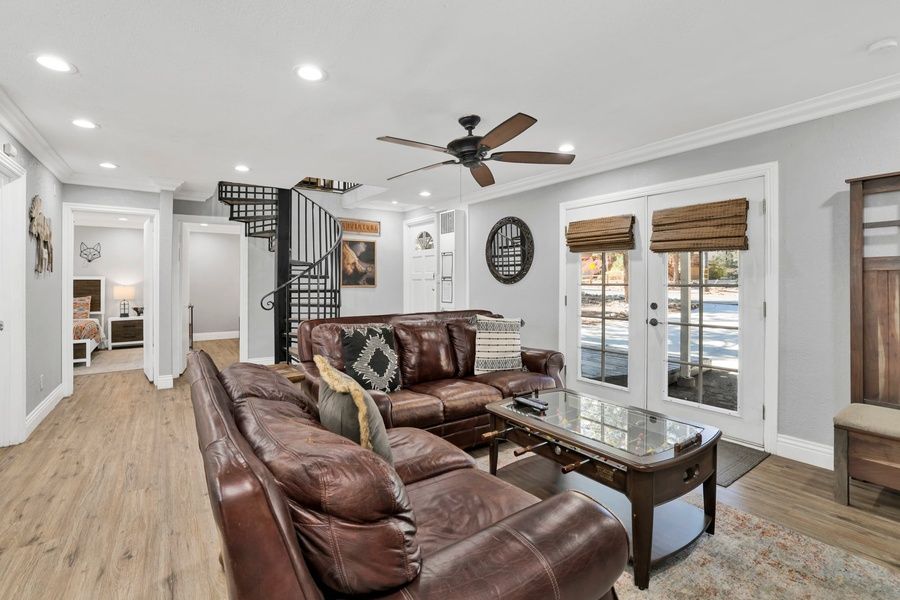 Nestled on a corner lot 5 minutes from town and 7 minutes from the lake shore, this 5BR/3BA home presents mountain views, two alfresco dining options, and an outdoor kitchen. The 2,400 square foot interior offers a renovated kitchen, two living areas, each with a wood-burning stove. The slopes and trails at Snow Summit and Bear Mountain are both 15 minutes from home. A two-car garage is an added perk.