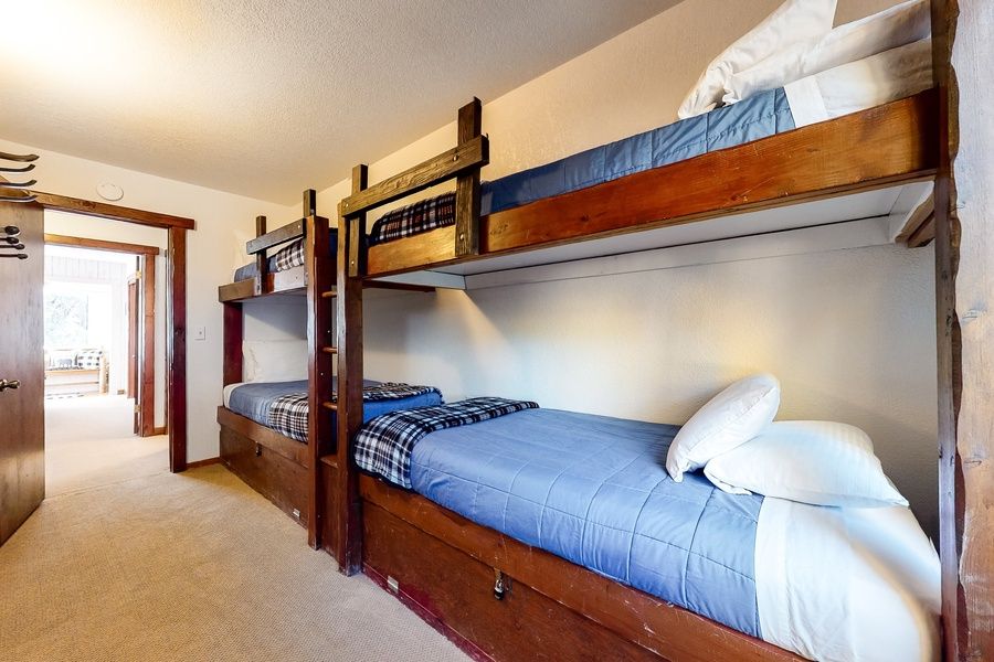 Kids in particular will love the bunk room, outfitted with four bunk beds. The master bedroom accommodates two on a queen bed. Baby gates and games for all ages are provided for young guests. A provided space heater offers extra warmth if needed.