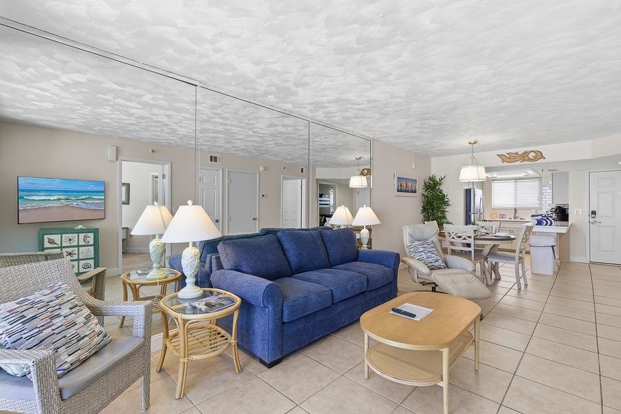 - A luminous SITTING AREA with floor-to-ceiling glass doors that has direct access to the balcony. The space features super comfy seating, a flat-screen Smart TV with cable channels + Showtime, a coffee table, and end tables that create a wonderful place to rest and recharge between activities.