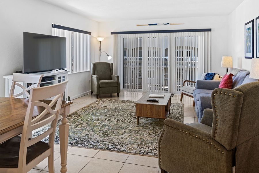 The condo’s airy layout makes relaxing easy. With two large bedrooms, comfy furniture, and a modern coastal aesthetic, your group will settle in right away.