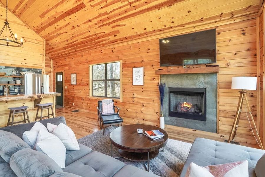 Our wall of windows is the hero of this cabin and the thing we hope makes you say "Wow!" when you walk in. Treat yourself to luxury in cabin form with soaring ceilings, stainless steel appliances, granite countertops, gas fireplace, outdoor firepit, great outdoor decks, hot tub, and nature trails. The cabin is designed with an open floor plan for enjoying time together whether it's inside around the fireplace enjoying the view of nature or outside on the large decks on upper and lower level feeling the breeze brush past. You'll love the spacious master suite on the upper level complete with ensuite bathroom with tile shower and direct access to the deck from the room. Downstairs there are two queen bedrooms with sliding door walkout to the lower-level deck. Full bath shared downstairs with double vanity. A common area downstairs is perfect for games or a movie! The hot tub is located on the lower deck for a soak after your day of hiking. We also have nature trails throughout the 5-acre property that you are welcome to walk throughout your stay. Please be mindful of guests that may be staying at the one-bedroom cabin nearby, you do have neighbors.
