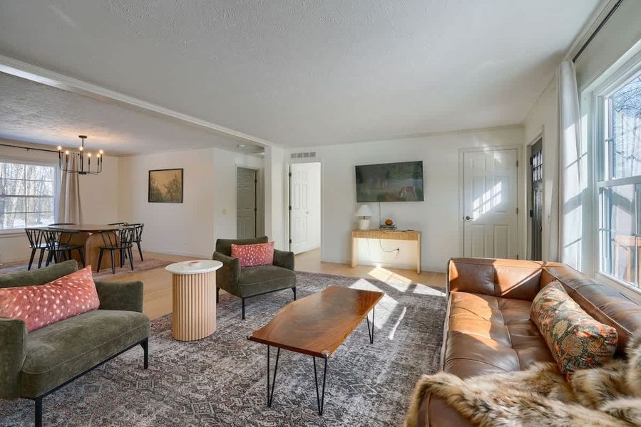 Relax on the comfy couch and watch your favorite show or enjoy the natural light beaming in from the large windows.
