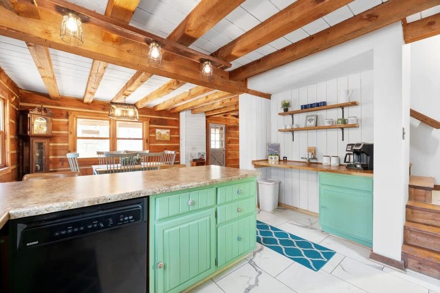 An organized and thoughtfully laid out kitchen, is fully equipped with all the appliances, utensils and cookware you need to feel at home. The dining room seats guests at the table.