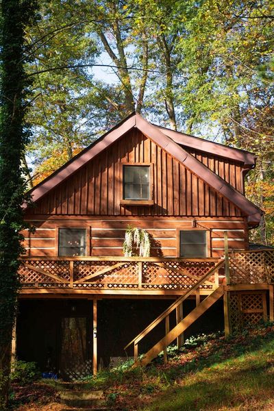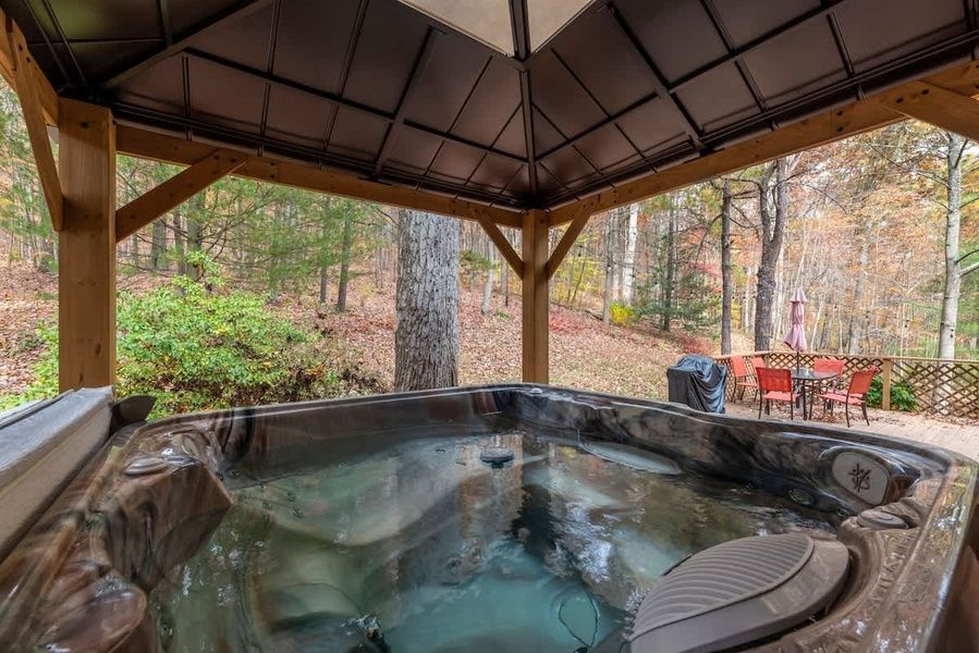 The exterior area of this cabin boasts beautiful ridge views! Step outside to enjoy a quiet morning on the front porch enjoying local wildlife, or soak in your private hot tub. Dining seating and BBQ are situated on the patio of this lovely cabin for use during your stay, as well as a firepit! (Please bring your own wood) Completely private on two wooded acres that guests can explore.